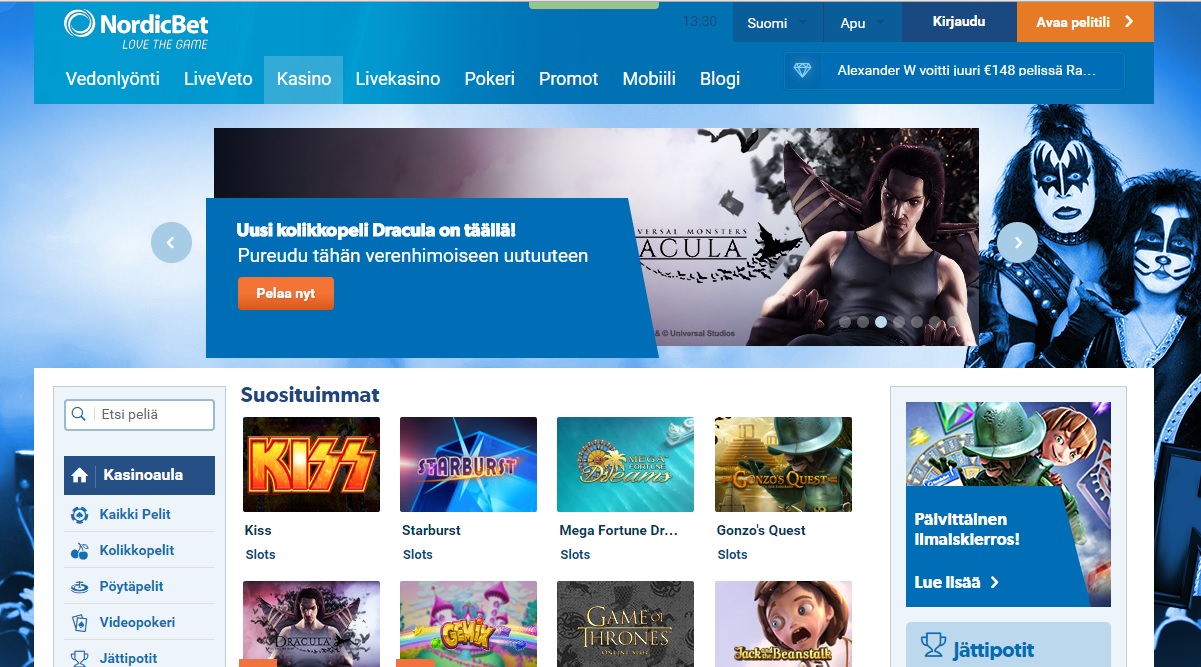 . Jos lyöt pääasiassa vetoja pohjoismaisista urheilukohteista on Nordicbet ehdoton ykkösvalinta. Mistään muualta et tule löytämään yhtä kattavaa kohdevalikoimaa ja hyviä kertoimia. Avaa nyt ilmainen pelitili Nordicbetille alla olevasta painikkeesta ja lunasta itsellesi huikeat bonukset.