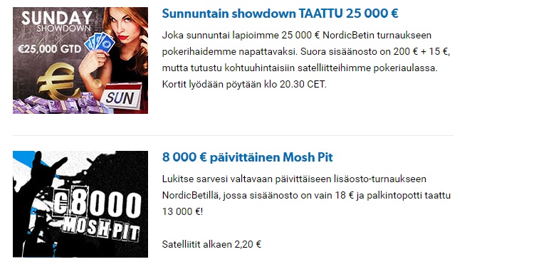 Ilmaisten freeroll turnausten lisäksi tarjolla on myös paljon turnauksia joissa voittopottiin on taattu jokin tietty rahasumma. Esimerkiksi joka päivä pelataan 8000€ mosh pit turnaus, johon osallistuminen maksaa 18€. Jos tuo 8000€ takuusumma ei tule täyttymään, niin Nordicbet pistää loput rahat omasta pussistaan turnauspottiin. Nämä loistavat takuuturnaukset ovat jo hyvä syy avata tili Nordicbetille. Parhaimmillaan voit osallistua vain sellaisiin turnauksiin joista joudut maksamaan huomattavasti vähemmän mitä palkintoina jaetaan.