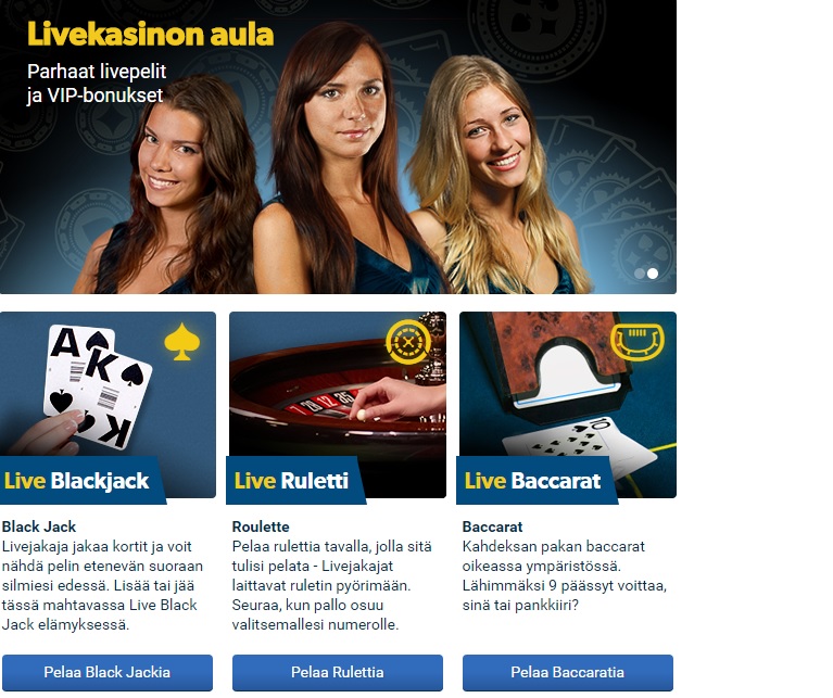 Live-kasinossa on tarjolla yhteensä viisi eri peliä: Blackjack, ruletti, baccarat, kolmen kortin pokeri ja casino holdem. Live-kasino toimii suoratoistoyhteydellä videokameran välitykselle joten sinun ei tarvitse ladata minkäänlaista ohjelmistoa sen käyttämiseen. Lähetys tulee suorana Latviasta, Riikasta jossa kauniit ja ammattitaitoiset pelinhoitajat pitävät pelit käynnissä.