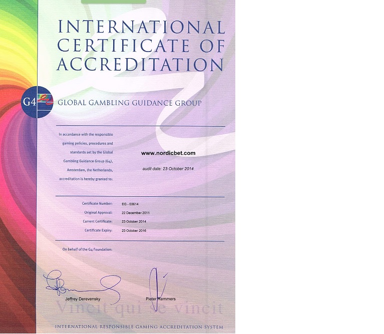 Nordicbetille myönnetty sertifikaatti vastuullisen pelaamisen alan standardien ja periaatteiden noudattamisesta.